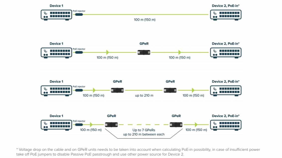 The GPeR unit allows to extend Ethernet cable by additional hop (< 100 – 150 m to regular network devices, and up to 210 m to another GPeR unit) up to 1,500 m.